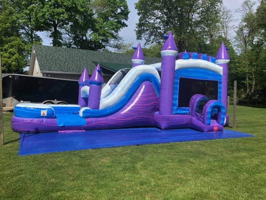 With its large 200 square foot bounce area, basketball hoop, tunnel entrance, rock climb wall and giant slide, The Purple Ice Palace is sure to provide hours upon hours of fun for all of your guests. The inflatable tunnel also provides safe entrance and exit, and the "no jump top" on the slide will make sure your guests stay protected when sliding down to the inflated landing area. This slide can be used dry or as a water slide in the warmer months. We will simply attach a water hose to the sleeve and you're ready for some wet and wild fun. In addition to an enclosed rooftop on the bounce area to prevent sun exposure, this inflatable also comes complete with a basketball hoop inside for added fun. This commercial grade inflatable can also accommodate 1,000 pounds in the bounce area at any given time. Individual weight limit is 180 pounds per person and each participant must be at least 34" tall. Also, book with confidence with our no risk weather cancellation policy. If bad weather is predicted for the day of your event, simply let us know if you'd like to reschedule or you are more than welcome to cancel for a full refund of your deposit. Please click here for all of our frequently asked questions.