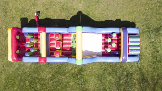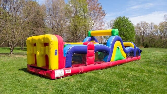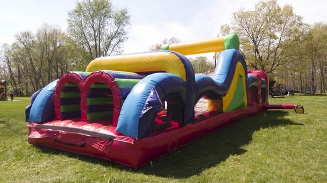Party Go Round's 40' Obstacle Course is our most popular obstacle course and a great choice for backyard parties or when the 70' or 100' obstacle course may not work for you. Just like all of our obstacle course rentals, the 40' Obstacle Course welcomes its challengers with two people shaped entrances to crawl through into each lane. From there it is a race to the finish for each participant as they push through vertical and horizontal hurdles, dive and crawl through the floor tunnels, climb up the wall and slide down to the finish. The addition of the tunnels on this model makes the challenge a little more exciting. What makes obstacle courses the perfect choice for any event is the awesome throughput. There's a constant flow of participants and the fun is non-stop without compromising wait time for eager challengers awaiting their turn.