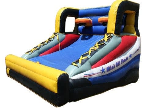 The All Stars inflatable basketball game from Party Go Round is the perfect addition to any indoor or outdoor event. Players will be lining up to take their shot at the dual hoops, which allow for plenty of action, fun and competitive spirit as players shoot it out with mini basketballs. This inflatable basketball game is designed on both sides to look like the profile of a high-top basketball shoe, with a little wit in the lace-ups. A red, white, blue and yellow color scheme with match any party theme.
