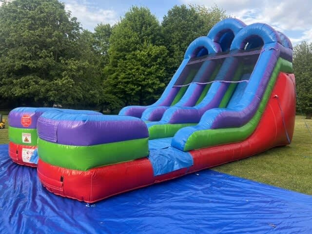 Experience twice the excitement with our 17-foot Retro Rainbow Double Bay Inflatable Water Slide from Party Go Round. This vibrant, rainbow-themed waterslide offers two lanes for simultaneous sliding fun, making it a standout attraction at any outdoor gathering, school field day, or backyard bash. Standing at an impressive 16 feet, it's not just a waterslide but a centerpiece of entertainment. Its universally appealing colors make it perfect for both boys' and girls' events, potentially doubling your investment's value. Enjoy it dry on cooler days for endless amusement, or attach a garden hose to its integrated misting system for a cool escape during hot summer days. Safety is a top priority in its design, evident in the inflatable landing zone with built-in drains, ensuring a low water level for fun yet safe play for kids of all ages.