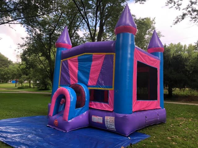 The Pink & Purple Bounce House is the perfect addition to any party. It's bright colors combined with over 180 square feet of bounce area will be a huge hit with your guests. Complete with a basketball hoop, the pink and purple bounce house also provides shade with it's covered roof, fingersafe netting on the back and sides for excellent supervision and ventilation to keep the unit cool as well.