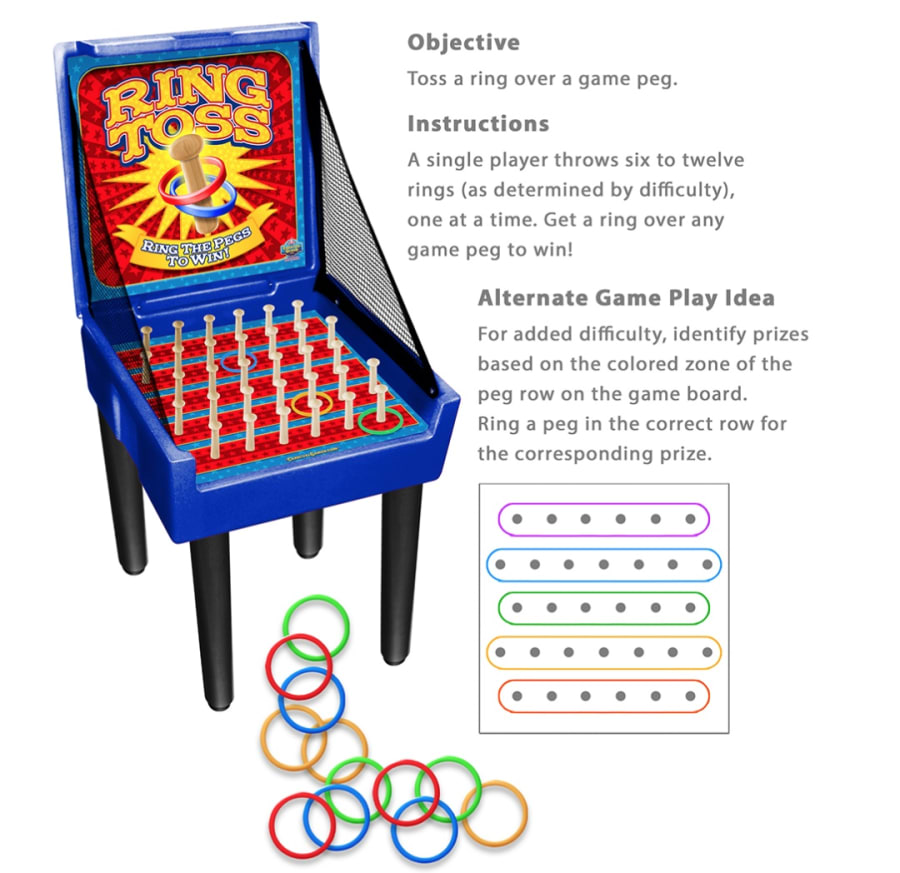 Step right up for another classic carnival game here! Toss a ring over the peg and win. A single player throws 6 to 12 rings (as determined by difficulty) one at a time. Get any ring over a game peg to win. For added difficulty, identify prizes based on the colored zone of the peg row on the game board. Ring a peg in the correct row for the corresponding prize.