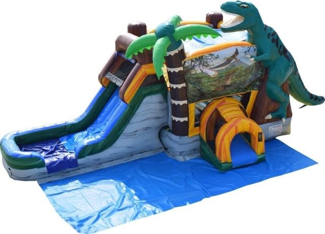 Look out for this bad boy! The Jurassic Dinosaur Combo is a HUGE HIT with kids and adults alike. This lifelike dinosaur towers over the entrance of this bounce and slide combo. This bounce house and slide combo can be used dry in the cooler months or simply hook up a water hose for hours of water slide fun.