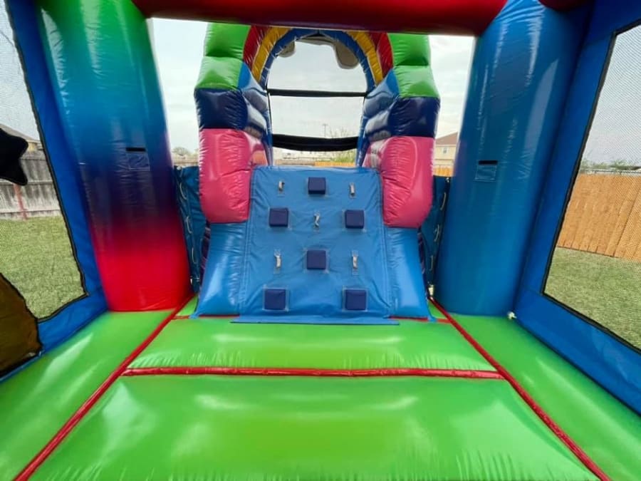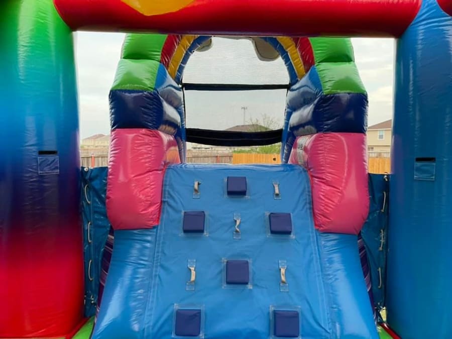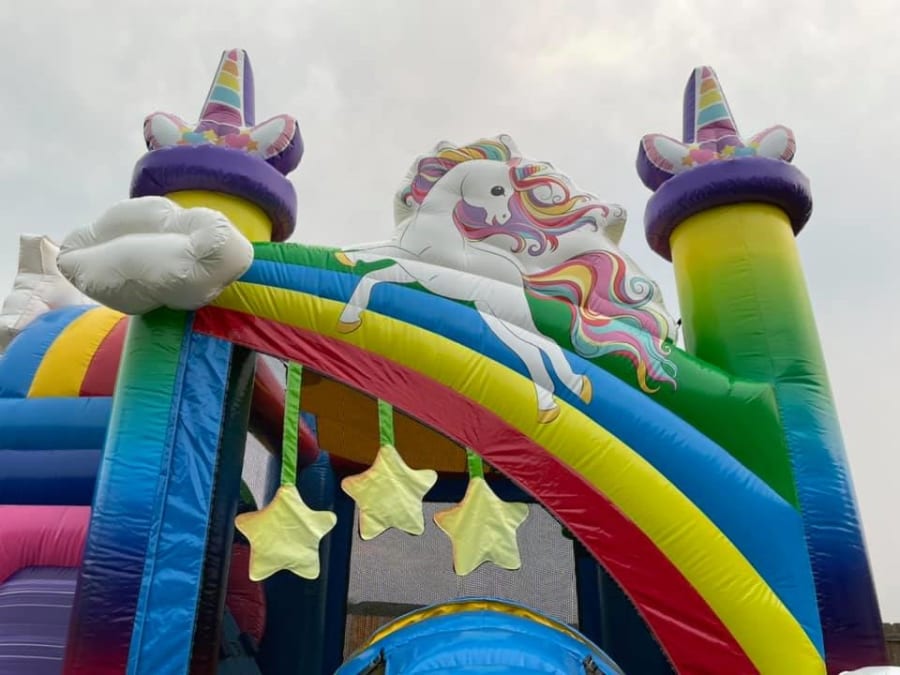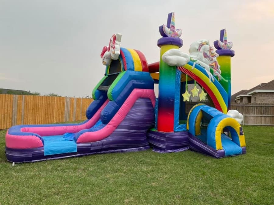 Our ULTIMATE UNICORN COMBO IS HOT!!! Featuring 3D unicorns, rainbows, clouds and more, this awesome bounce and slide combo will be the hit of any party. This combo can be used dry or simply hook a hose up for some awesome water slide fun!