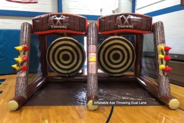 Axe Throwing has become a popular trend and now you can bring it to your event with our Inflatable Axe Throwing inflatable rental! This inflatable interactive game uses foam, vinyl and velcro “axes” and a velcro target in the form of a bullseye making it absolutely safe for all ages. Use axe throwing as team building, competition or just for fun! Two axe throwing lanes are available for your event.