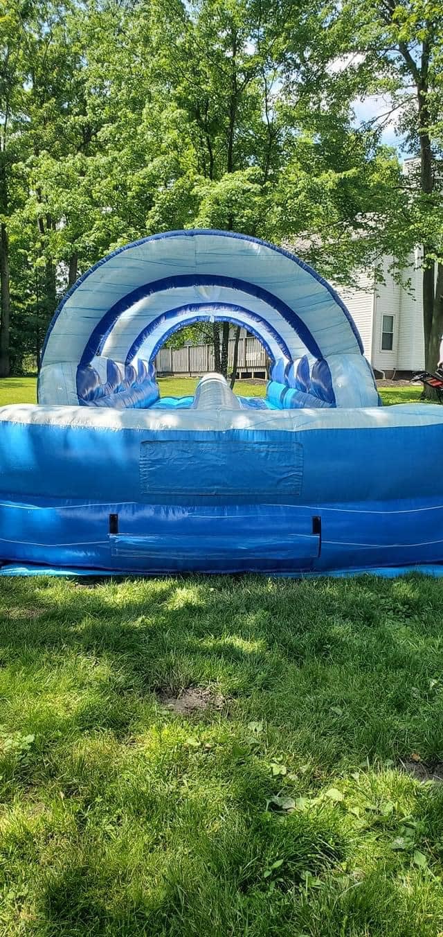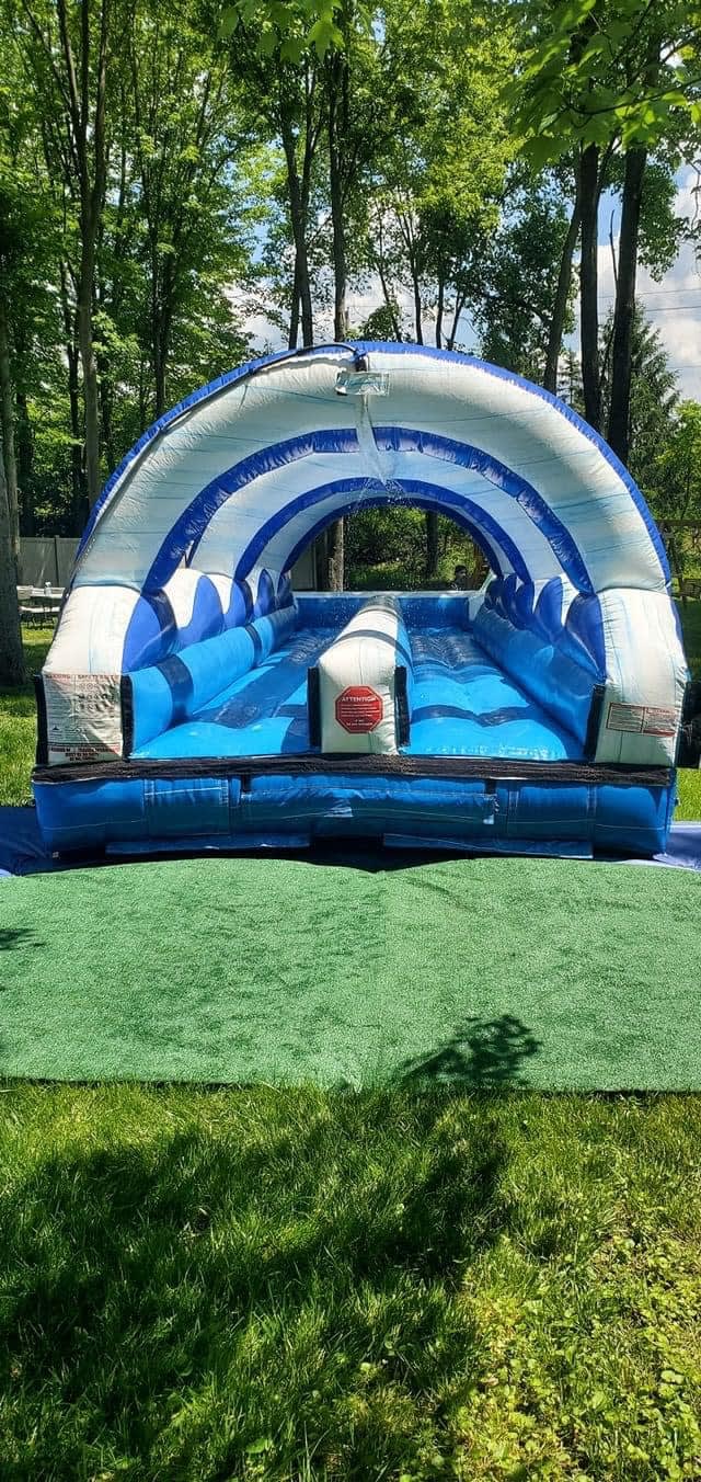 WOW! Take a look at this amazing 35' long double lane slip n slide. Your guests will have non-stop fun and excitement as they launch down the lanes of this wet and wild slip n slide. With it's beautiful blue marble design, your party will be the coolest in town. Simply hook a standard water hose up to the top and this patented misting system will be spraying your guests as they barrel down this amazing attraction. Have the hottest party in town with this cool slip n slide.